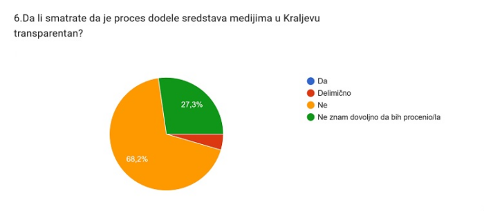 Zanimljivo je i da u anketi čak 95,2 odsto ispitanika navodi da nikada nije čulo za portal Narcis i jorgovan koji dobija sredstva poslednjih godina na konkursu za medije u Kraljevu, 80,5 odsto da ne zna za postojanje portala Infoplus koji redovno dobija sredstva, a 61,9 odsto za postojanje portala InfoKVpres.