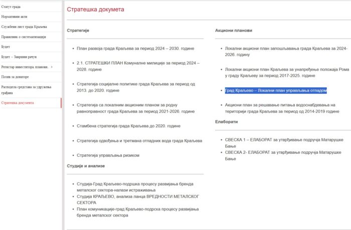 Povod: Pregled zvanične internet prezentacije Grada Kraljeva u odeljku za strateška dokumenta i zaštitu životne sredine.