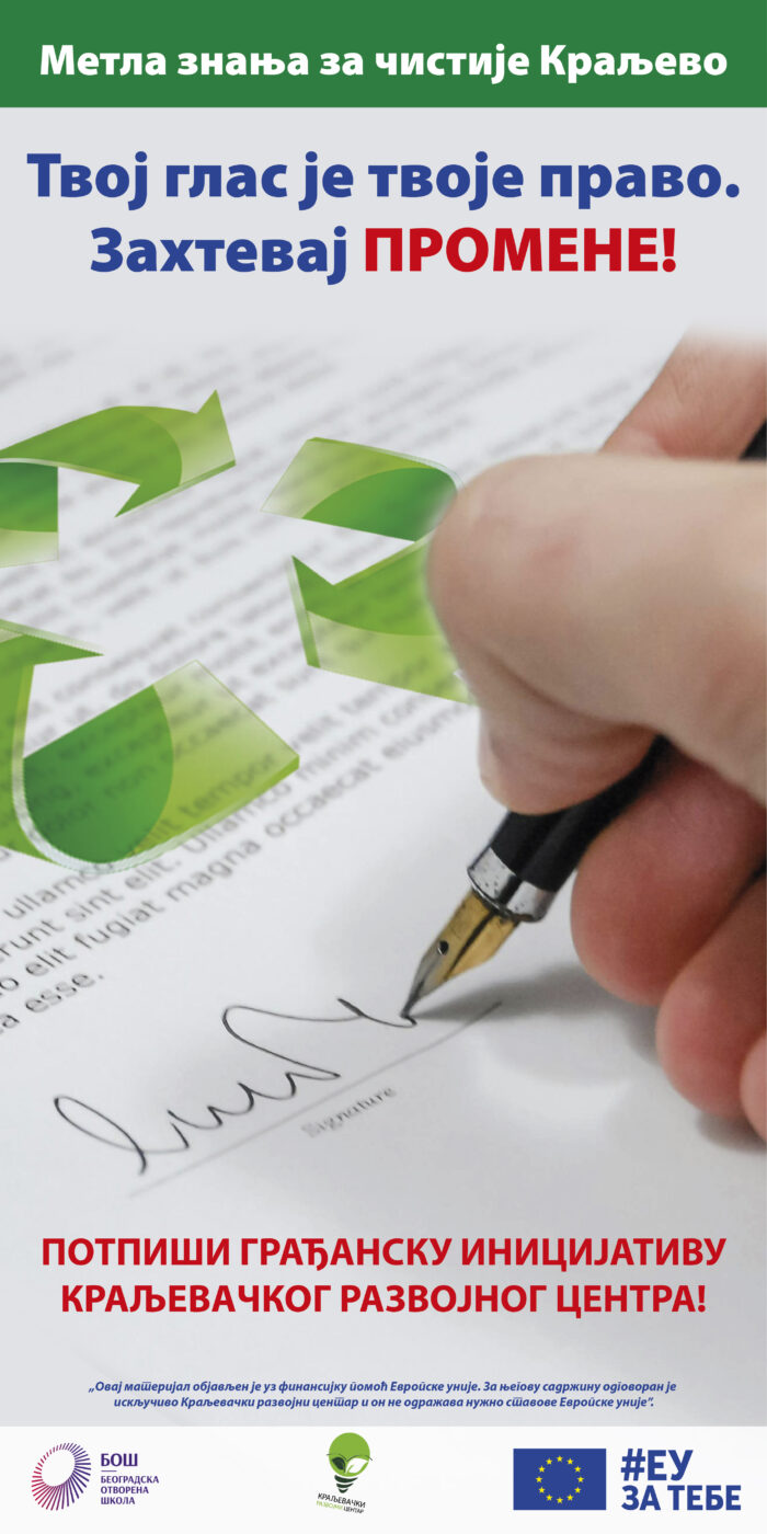 Apel građanima: Ukoliko ste saglasni da je problem nesanitarne deponije, koja već 54 godine opterećuje naš grad, ozbiljan i zahteva hitno rešenje, pratite aktivnosti Kraljevačkog razvojnog centra i podržite Građansku inicijativu/peticiju. Svoj potpis možete dati onlajn, ili lično tokom predstojećih Uličnih akcija u Dositejevoj ulici i na Trgu srpskih ratnika. Na taj način, zahtev da se o ovom pitanju razgovara tamo gde i treba – u Skupštini grada Kraljeva – postaće glas svih nas.